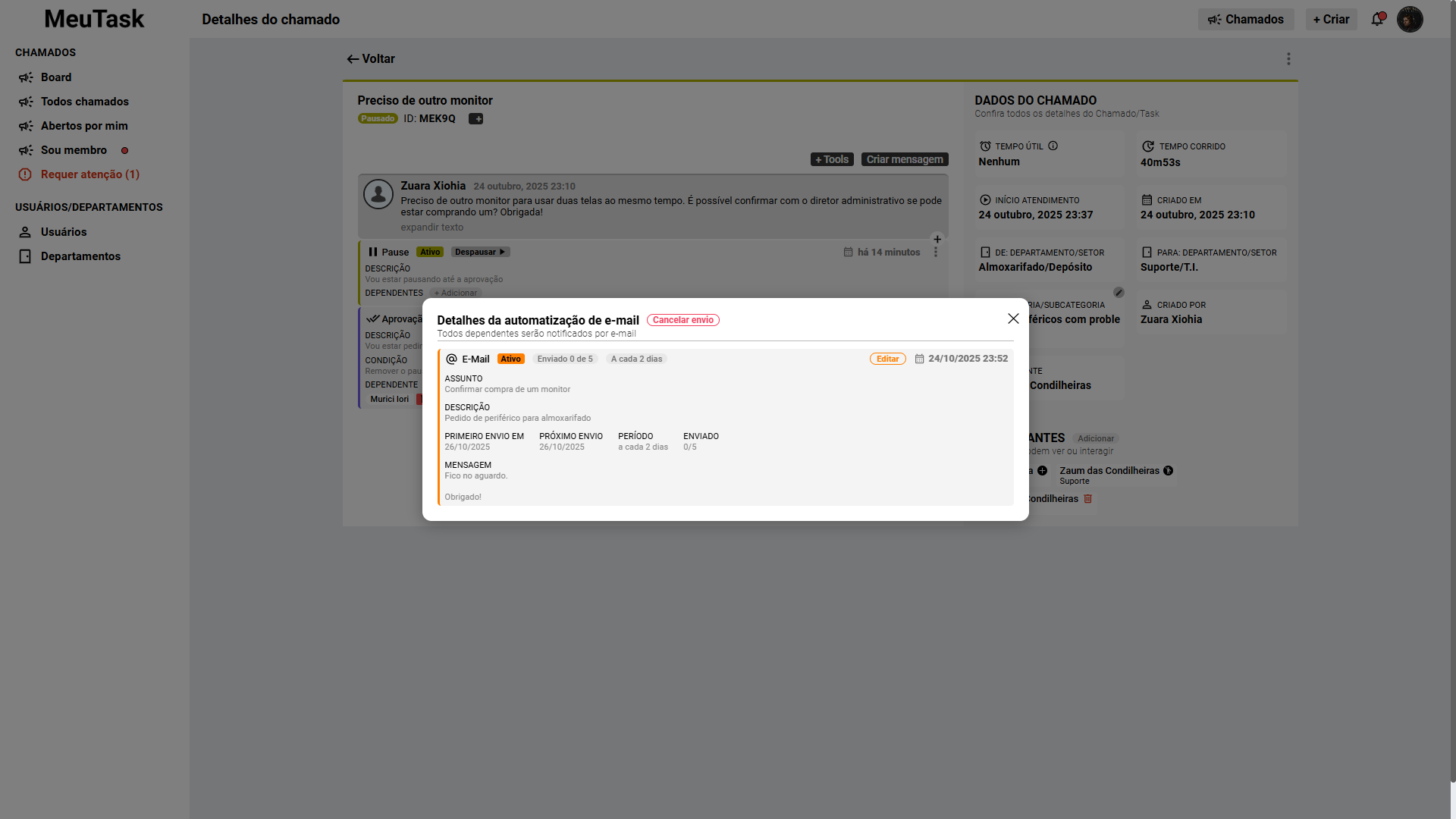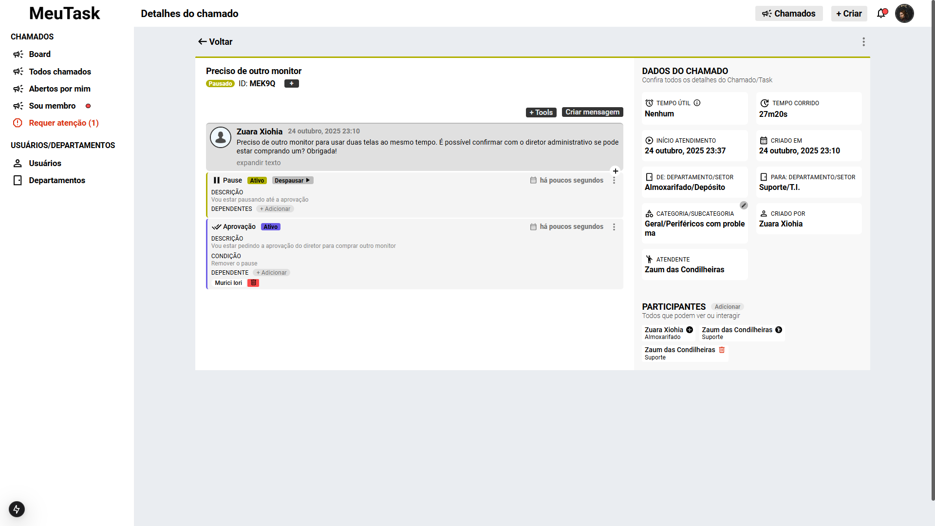 - Peça, aprovações de colaboradores para prosseguir com o chamado/ticket.